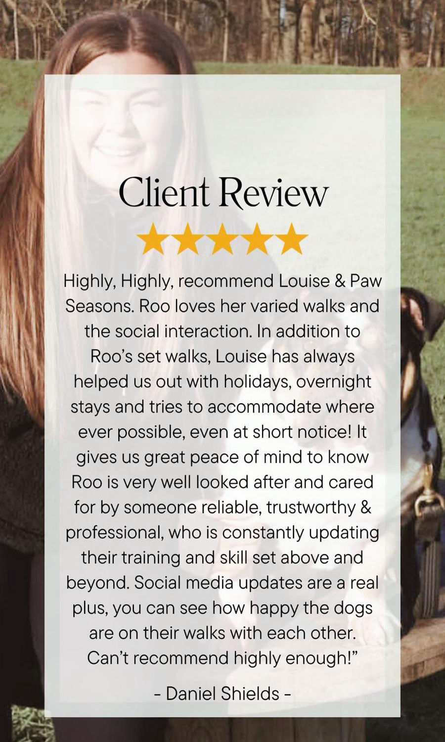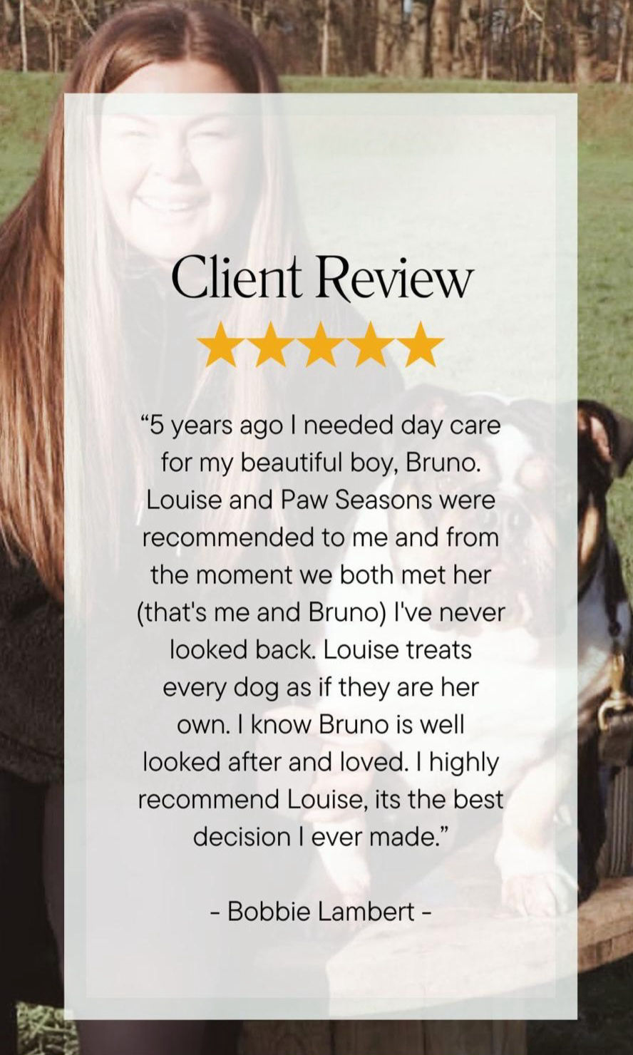 A perfect option for when you have commitments or go on holiday. A true home from home experience where your dog can relax. They will be well exercised, given their yummy dinners and sleep well.