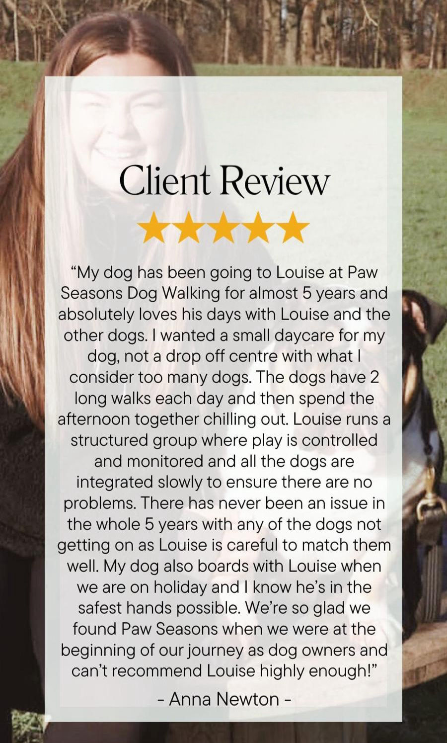 A perfect option for when you have commitments or go on holiday. A true home from home experience where your dog can relax. They will be well exercised, given their yummy dinners and sleep well.